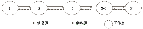 如圖所示,實線為物流,虛線為信息流。推進式生產方式的物流是從工序1、2、3一直到N-1,而信息流則是生產計劃部門和每一道工序的虛線的延續。很顯然,推進式生產方式的信息流和物流是分開的。