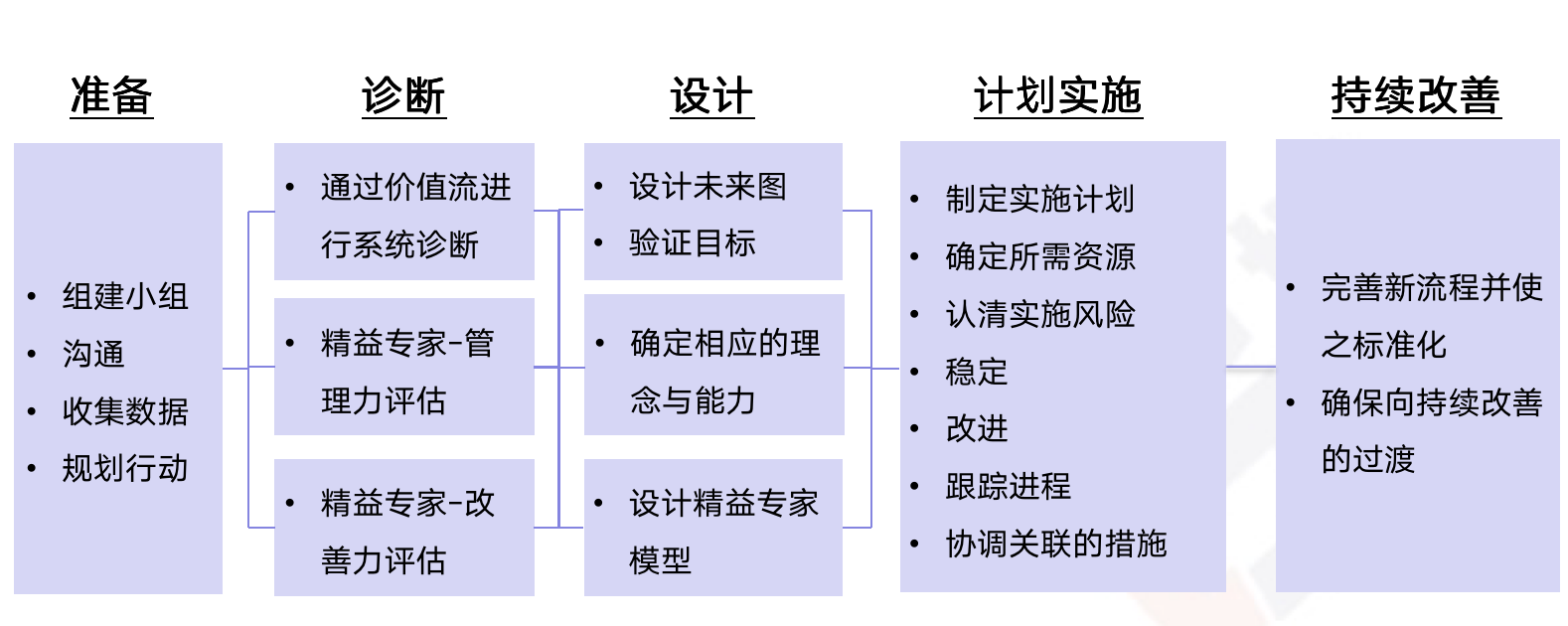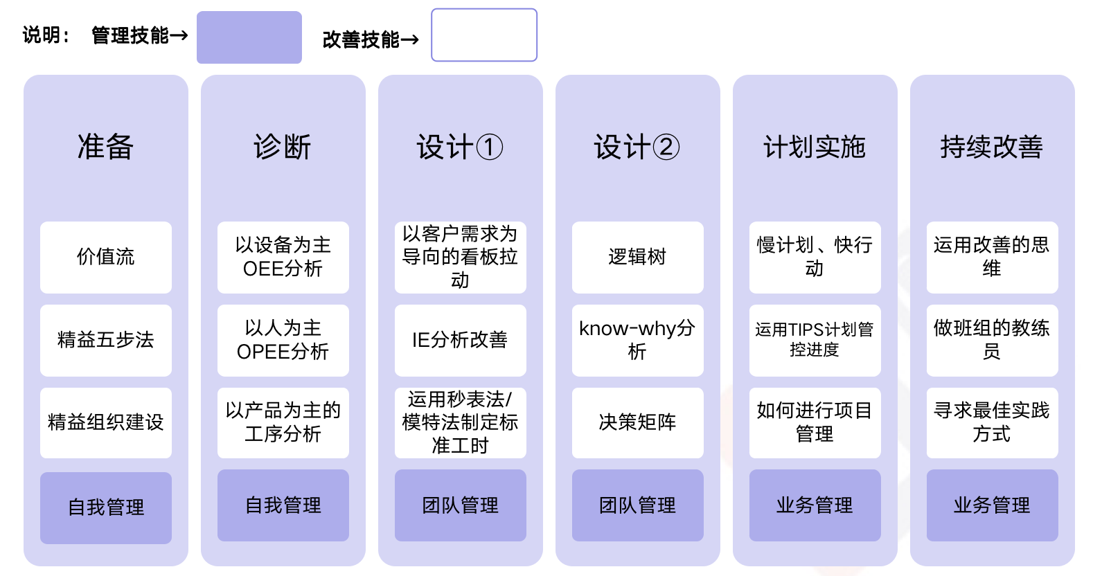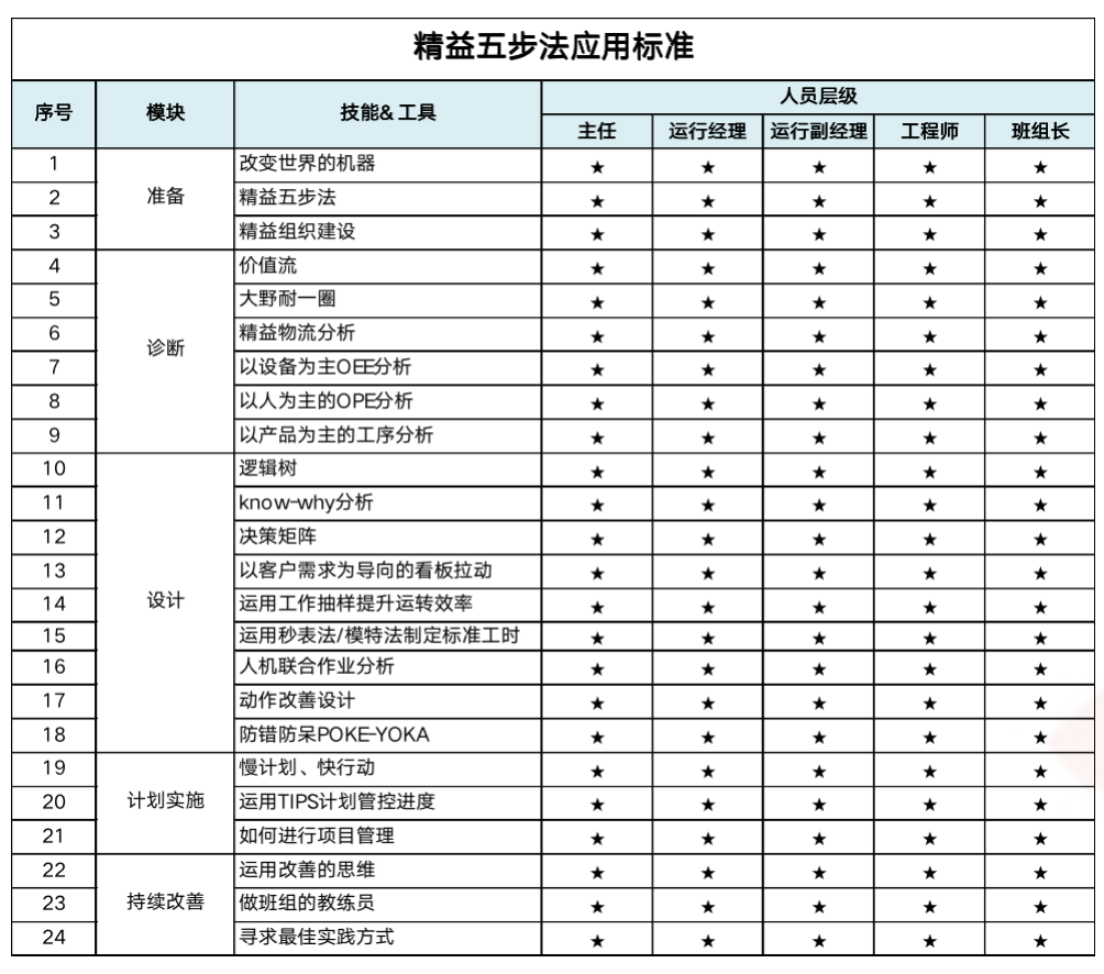 從精益五步法“準備、診斷、設計、計劃實施、持續改善” 和自我管理、團隊管理、業務管理等方面,梳理各層級人員應該掌握的技能;