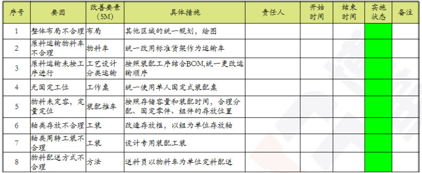 ●等待浪費(fèi):組件的安裝沒有按照定時(shí)定量的方式裝配、裝配好沒有放在固定區(qū)域,造成等待