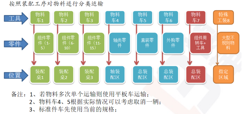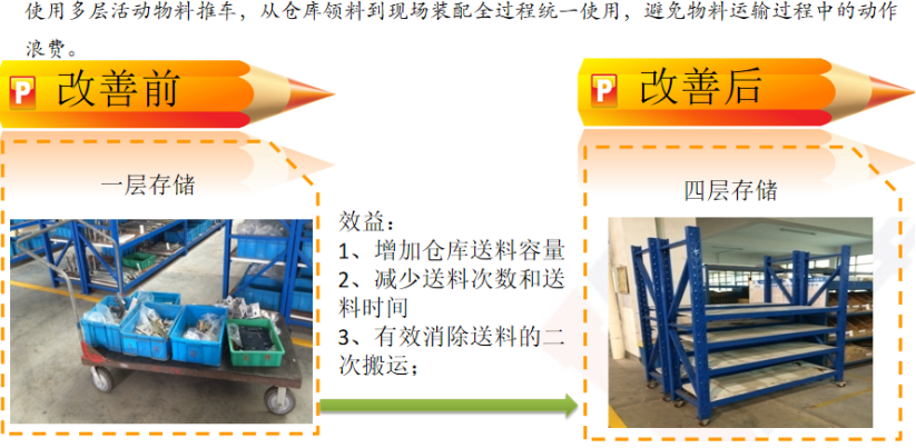 ●搬運(yùn)浪費(fèi):物料運(yùn)輸過程中,送料員用平板車,需多批次運(yùn)輸,且需將物料搬運(yùn)至地面;裝配員再將物料搬運(yùn)至裝配區(qū);