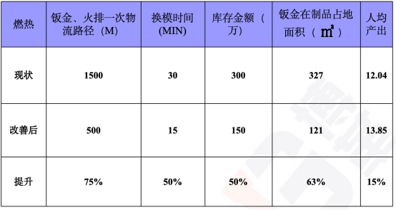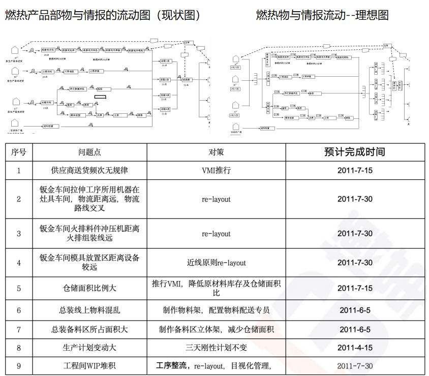 通過對配件車間內(nèi)油壓機,火排沖壓設(shè)備,火排裝配線,水箱沖壓設(shè)備,小U開料設(shè)備,總裝車間備料區(qū)等設(shè)施進行重新規(guī)劃、調(diào)整,減少車間一次物流距離1500M,在制品面積下降63%,庫存金額下降50%。通過燃熱產(chǎn)品部物與情報現(xiàn)狀圖與理想圖對比,得出目前存在的問題并設(shè)置改善對策。