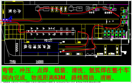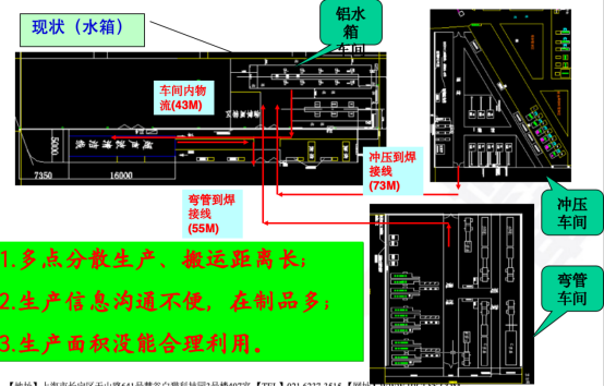 分析鋁水箱車間物流示意圖發(fā)現(xiàn),鋁水箱沖壓至裝配工序物流距離73M,彎管工序至裝配車間55米。且存在多點分散生產(chǎn)、搬運距離長;生產(chǎn)信息溝通不便,在制品多;生產(chǎn)面積沒能合理利用等問題,因此重新調(diào)整生產(chǎn)布局,簡化物流路線。