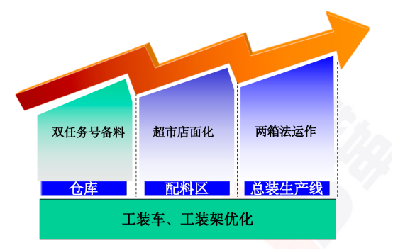 兩箱法導(dǎo)入:配送量得以統(tǒng)一,配送過程避免盲目性、隨意性,利于現(xiàn)場整理、整頓;兩箱法能直觀顯示物料缺失信息,便于信息化管理。