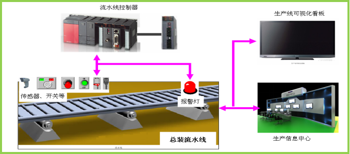 拉動式生產,生產線進度實時反饋給配送區,技術形式:生產看板和物料按燈系統;