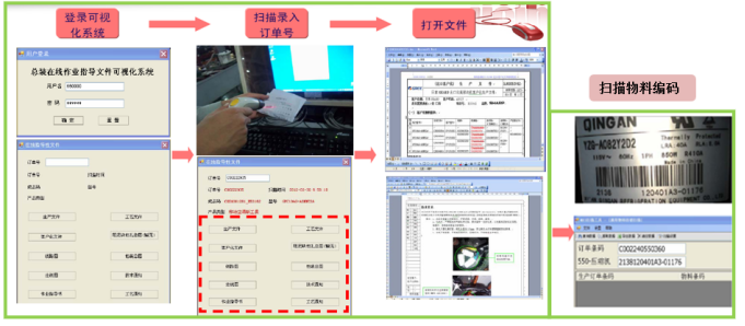 關鍵重點物料防錯掃描及可視化系統,掃描訂單號后自動顯示該崗位相應工藝文件,指導員工裝配并保證信息為最新要求;掃描物料條碼,系統自動判定使用物料與訂單需求是否一致。