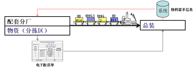 配送,根據生產計劃和生產線物料需求,系統自動生產物料配送單,按單齊套物料,定時定點配送到總裝工位;