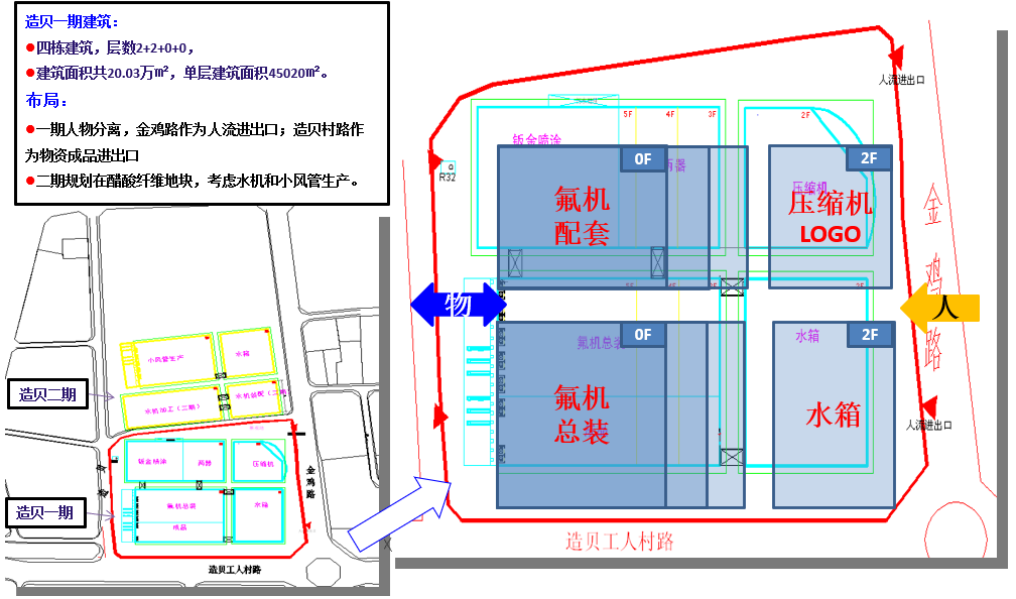 • 一期人物分離,金雞路作為人流進出口;造貝村路作為物資成品進出口