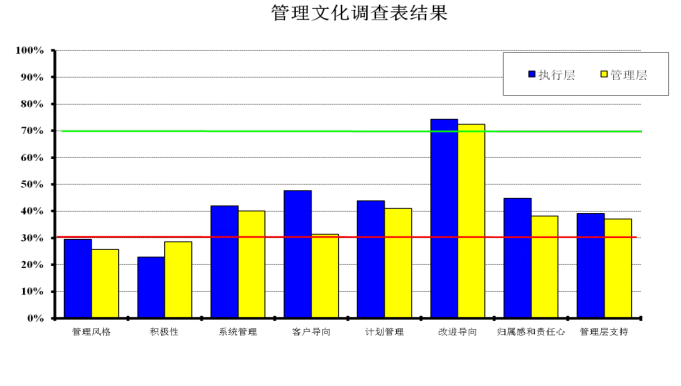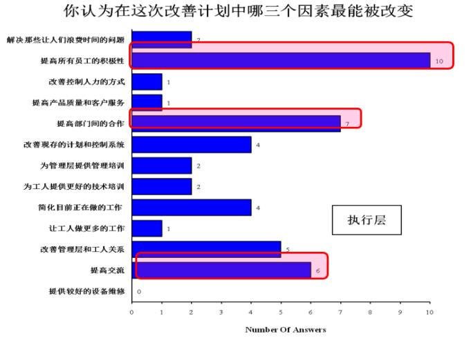 結(jié)論:?jiǎn)T工和管理人員在“積極性” “管理風(fēng)格” 方面認(rèn)同感和滿意度最差, 全員“改進(jìn)導(dǎo)向”比較強(qiáng)烈,說(shuō)明大家希望變革。