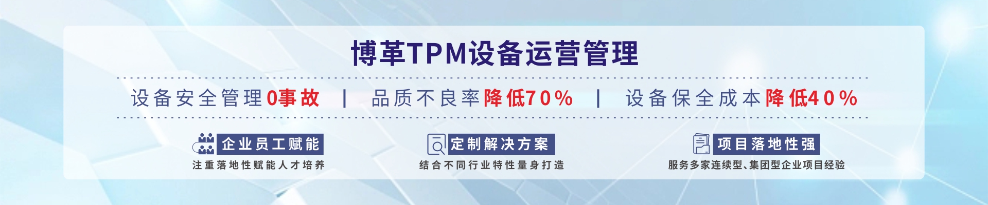 博革咨詢經(jīng)過(guò)20年的發(fā)展,為國(guó)內(nèi)外大型集團(tuán)提供咨詢服務(wù),積累了集團(tuán)性的項(xiàng)目統(tǒng)計(jì)推進(jìn)經(jīng)驗(yàn)。輔導(dǎo)的部分集團(tuán)公司有:華潤(rùn)集團(tuán)、徐工集團(tuán)、海爾集團(tuán)、洋河集團(tuán)、中金嶺南、許繼集團(tuán)、九陽(yáng)集團(tuán)、大全集團(tuán)、上藥集團(tuán)、中信集團(tuán)、中天科技等。 博革咨詢總結(jié)出一套適合中國(guó)企業(yè)的TPM管理模式(包含:設(shè)備的前期管理、初期管理、運(yùn)維管理、技術(shù)管理、資產(chǎn)管理、信息化管理等設(shè)備全壽命周期管理),使設(shè)備有效生產(chǎn)率最高、設(shè)備運(yùn)維費(fèi)用最低,逐步實(shí)現(xiàn)TPM的四個(gè)“零”目標(biāo)。 博革咨詢?yōu)楸姸嗟目蛻籼峁㏕PM咨詢服務(wù)過(guò)程中,設(shè)備的相關(guān)指標(biāo)(設(shè)備故障率、設(shè)備平均故障間隔期MTBF、設(shè)備平均維修時(shí)間、設(shè)備故障頻次、設(shè)備備品備件金額、設(shè)備維修費(fèi)用、設(shè)備能源消耗、設(shè)備綜合效率OEE等)年度平均改善率達(dá)10%~30%,顧問(wèn)老師深入?yún)⑴c到企業(yè)的執(zhí)行層面,具備“老師”、“教練”、“推進(jìn)者”三重角色,確保目標(biāo)達(dá)成。 | ![]() |